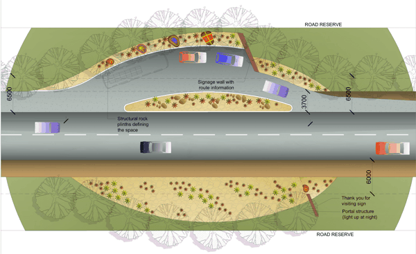 Designs of the Portals to be situated on various roads entering the area. These portals will indicate arrival on the route and contain information about the route and its attractions.